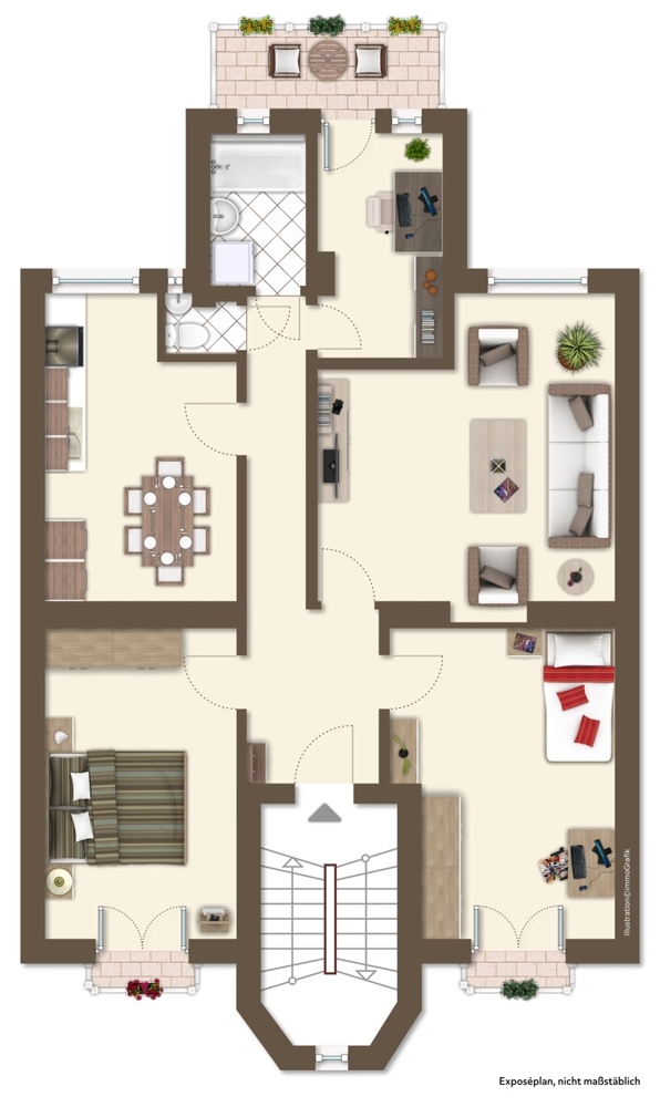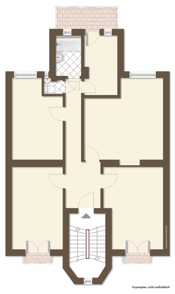 Die Wohnung umfasst mit knapp 95m² Wohnfläche vier Zimmer, eine Küche, einen Flur, ein Tageslichtbad mit Badewanne, ein separates WC, einen Balkon zur Gartenseite und französische Balkone zur Straßenseite.
