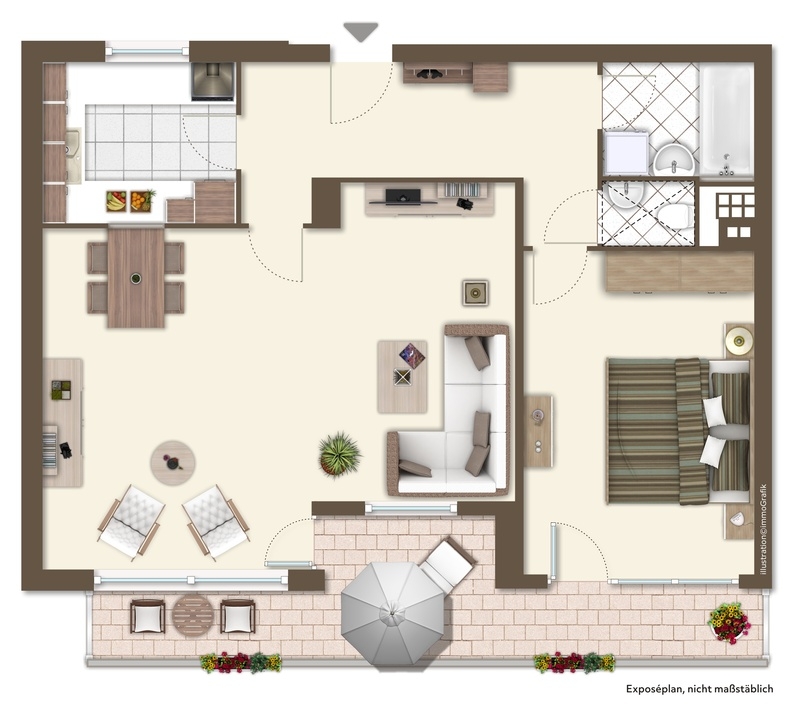 Die Wohnung verfügt aktuell über einen großzügigen Wohn-/Essbereich mit Zugang zur Dachterrasse in Südwestausrichtung, ein Badezimmer mit Badewanne und Waschmaschinenstellplatz, ein separates WC sowie ein Schlafzimmer (ebenfalls mit Zugang zur Terrasse).