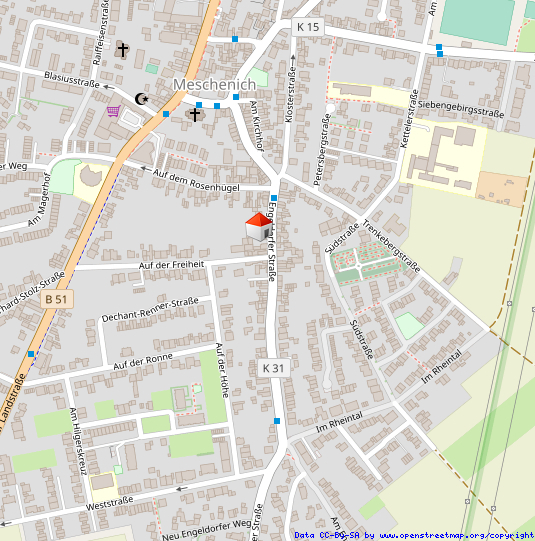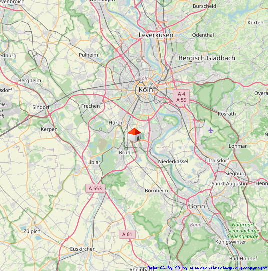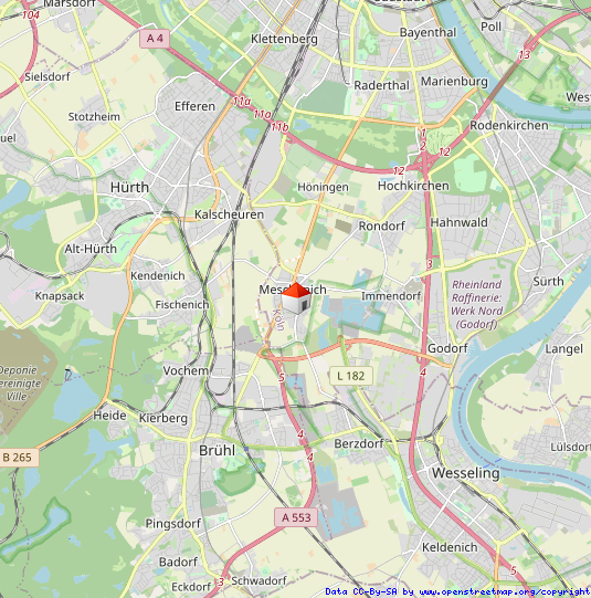 LagebeschreibungDas Haus liegt in Alt-Meschenich im Kölner Süden. Abgelegen von den westlich gelegenen Hochhausarealen bietet der südliche Ortsteil sowie der alte Ortskern viele frei stehende Einfamilienhäuser, Reihenhäuser und kleinere Mehrfamilienhäuser. Alte, ländlich geprägte Häuser und moderne Bauten reihen sich harmonisch aneinander.