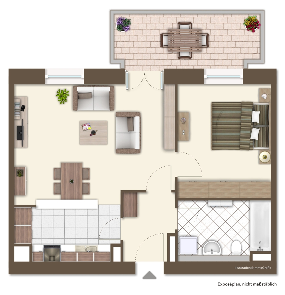 Die Wohnung umfasst mit ca. 60 m² Wohnfläche einen großzügigen Wohnbereich mit Zugang zum Balkon, ein Badezimmer mit Badewanne, eine offene Küche mit Thekenbereich zum Wohnraum, sowie ein Schlafzimmer.