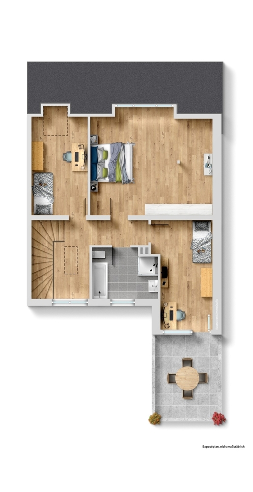 Drei Wohn-/Schlafzimmer (ein Zimmer mit Dachterrasse)