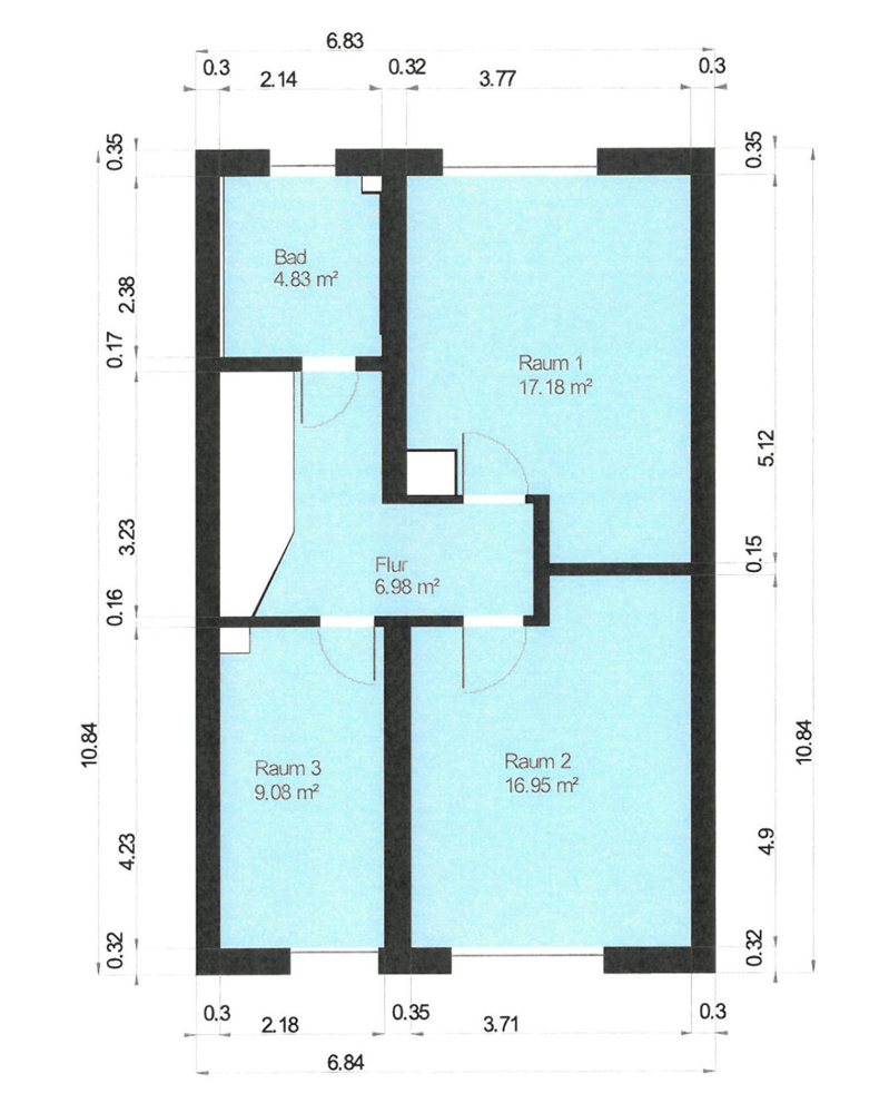 Im Obergeschoß befinden sich 3 Zimmer (ca. 17.18 m² / 16,95 m² und 9,08 m²) das Tageslichtbad mit Badewanne und der Flur.
