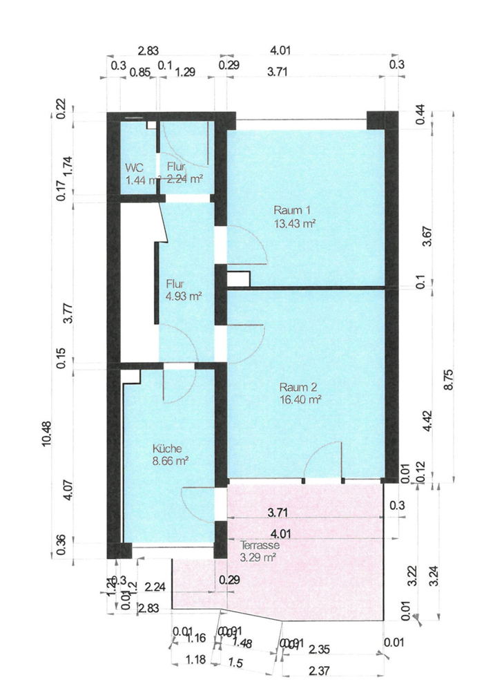 Das Zimmer zur Straße ist ca. 13,43 m² groß, das Wohnzimmer ca. 16,40 m² und die Küche ca. 8,66 m²,