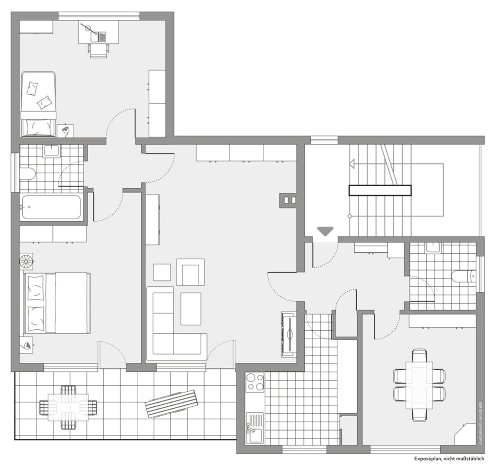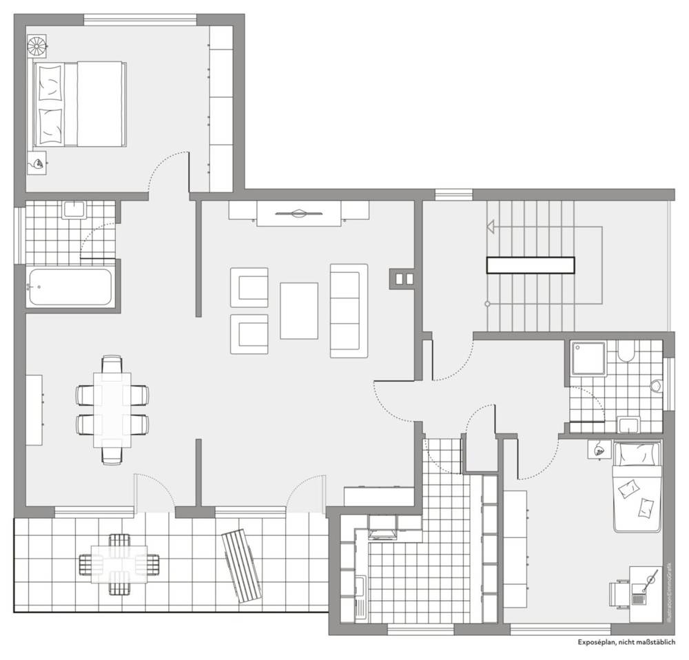 (ca. 45 m² groß), Wannenbad ebenfalls mit Tageslicht, Schlafzimmer und Balkon, der von Wohn- und Essbereich betreten werden kann.