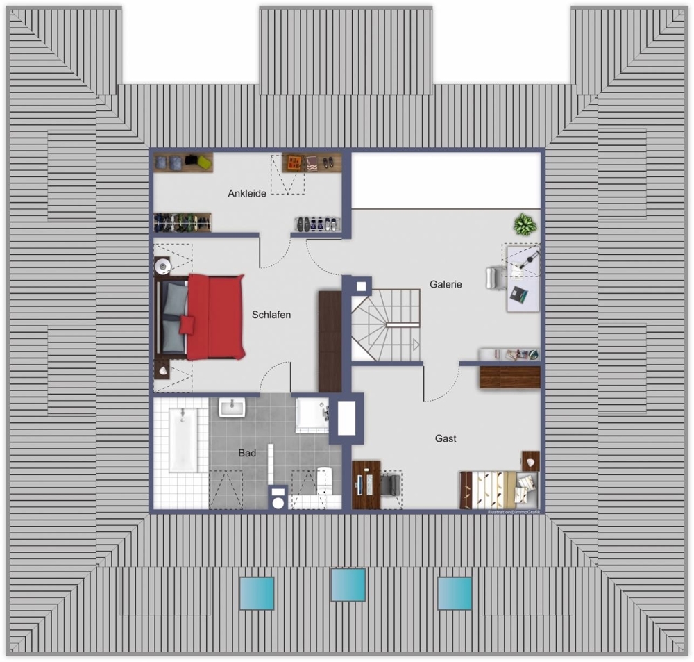 Die Galerie bietet neben zwei Wohn-/Schlafräumen ein weiteres Bad mit Whirlwanne und Dampfdusche sowie eine Empore mit Blick ins Wohnzimmer. Hochwertige und passgenaue Einbauschränke bieten viel Stauraum in den Dachschrägen und sind bereits im Kaufpreis enthalten.