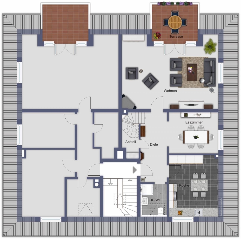 Die Wohnung bietet mit ca. 125 m² Wohnfläche verschiedenste Gestaltungsmöglichkeiten. Auf der unteren Ebene liegt der großzügige Wohnbereich mit Zugang zur Sonnenterrasse in Südausrichtung, ein Tageslichtbad mit Dusche, eine geräumige Wohnküche sowie der separate Essbereich.