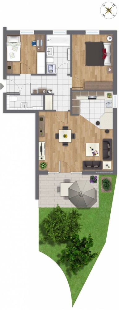 Die Wohnung bietet ca. 76m² Wohnfläche und ca. 30 m² Garten. Die Wohnfläche verteilt sich auf Diele, 2 Badezimmer, 2 kleinere Schlafräume und ein großes Wohnzimmer mit integrierter, offener Küche mit Zugang zur Terrasse und zum Garten.