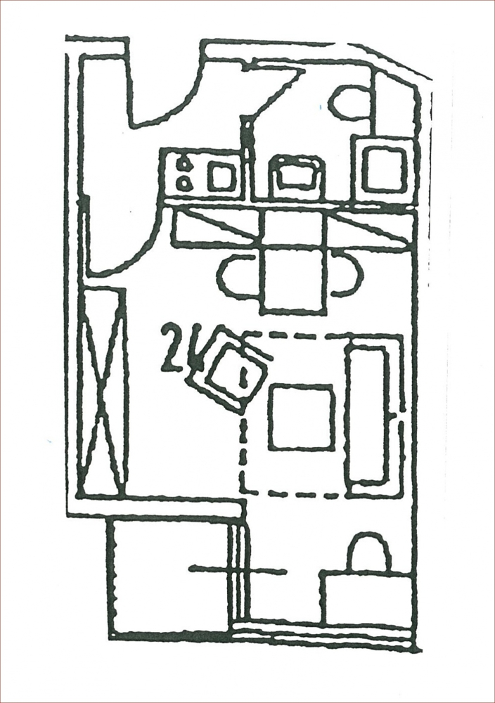 Die Wohnung verfügt über einen Wohn/-Schlafbereich mit Balkon, einen Flur mit integrierter Pantryküche sowie ein Duschbad. Die Küche verfügt über Kühlschrank, Spüle, Kochfelder und Oberschrank und steht im Eigentum des Vermieters. Das weiß geflieste Badezimmer bietet Dusche, WC und Waschbecken. Im Wohn-/Schlafraum befindet sich ein gepflegter Teppichboden. Die übrigen Bereiche sind gefliest. Im Objekt existiert ein Fahrradkeller sowie eine Gemeinschaftswaschküche, in der Waschmachinen und Trockner gegen Münzeinwurf genutzt werden können.