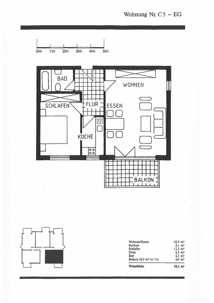 Die Wohnung verfügt über ein geräumiges Wohn- /Esszimmer mit Zugang zur überdachten Terrasse, eine kleine Arbeitsküche, ein Schlafzimmer, einen Dielenbereich sowie ein hell gefliestes Badezimmer mit Badewanne. Die Wohnung ist im Wohnzimmer und im Flur mit einem Laminatboden ausgestattet. Die Küche und das Badezimmer sind hell gefliest. Im Schlafzimmer befindet sich ein Teppichboden. Eine Gemeinschaftswaschküche und ein Gemeinschaftstrockenraum stehen allen Bewohnern des Hauses zur Nutzung frei. Das Objekt ist mit Heizkostenverteilern und Wasseruhren ausgestattet und wird über eine zentrale Gasheizung beheizt. Zu der Wohnung gehört ein Kellerraum und ein KFZ-Stellplatz in der zur Wohnanlage gehörenden Sammeltiefgarage.