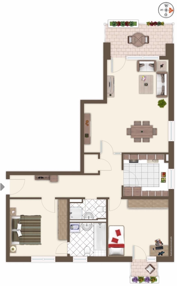 Die Wohnung ist ideal für Pärchen, die ein Arbeits- oder Gästezimmer benötigen. Für Familien mit einem Kind bietet die Wohnung ebenfalls beste Aufteilungsmöglichkeiten.
