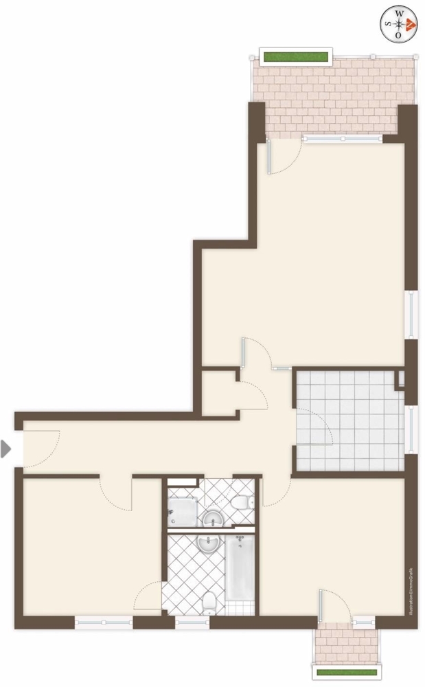Die Wohnung verfügt über drei Wohn-/Schlafräume, zwei Bäder, Diele, Küche und Abstellraum. Es gibt einen kleinen Balkon zur Straße und eine große Loggia zur Sonnenseite im Wohnzimmer. Das Hauptbad wird zum Jahreswechsel für die neuen Mieter saniert. Die vorhandenen Teppichböden in den zwei kleineren Zimmern werden durch Laminat ersetzt. Der Parkettboden im Flur und im Wohnzimmer wird neu versiegelt. Die Wohnung wird renoviert übergeben.