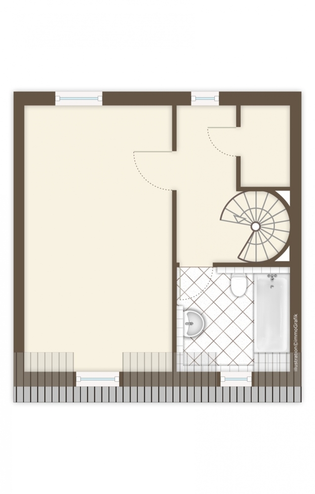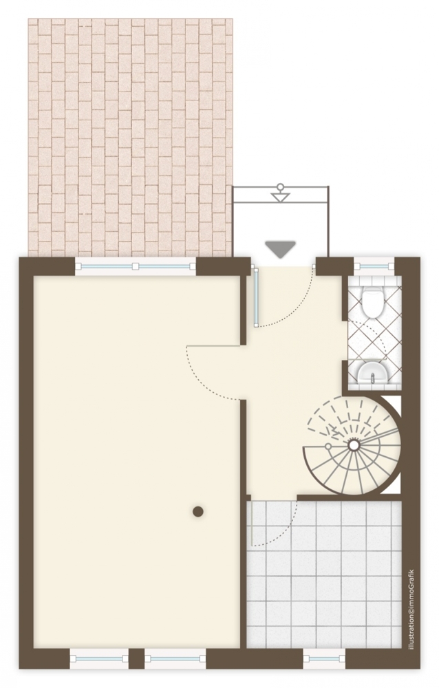 Die Maisonettewohnung mit eigenem Eingang liegt im hinteren Teil des Hofes und verfügt über zwei Zimmer, Diele, Tageslichtbad und Küche sowie eine Terrasse in Westrausrichtung (Abendsonne).