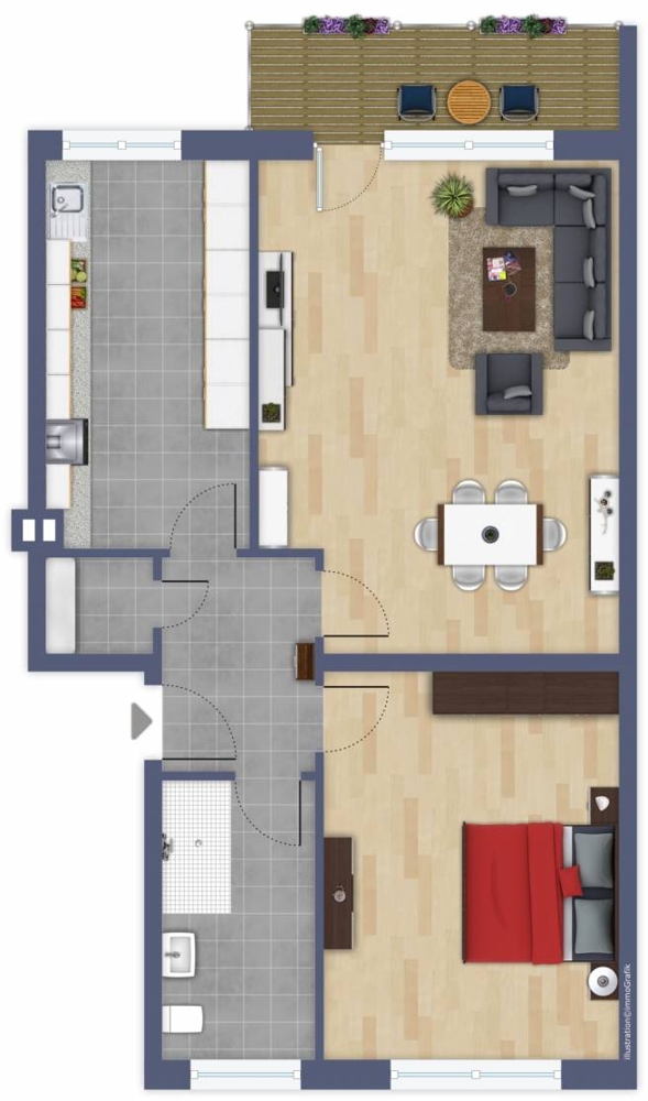 Die Wohnung verfügt neben dem Wohnzimmer mit Zugang zum Balkon über ein Schlafzimmer, eine Küche, ein Tageslichtbad, ein Abstellraum im Flur.