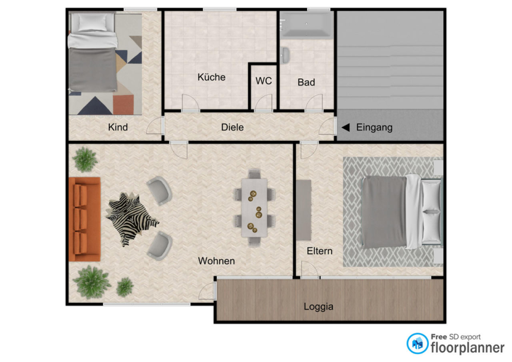 Alle Räume sind vom Flur erreichbar und die Loggia ist vom Wohnzimmer sowie einem Schlafzimmer begehbar.