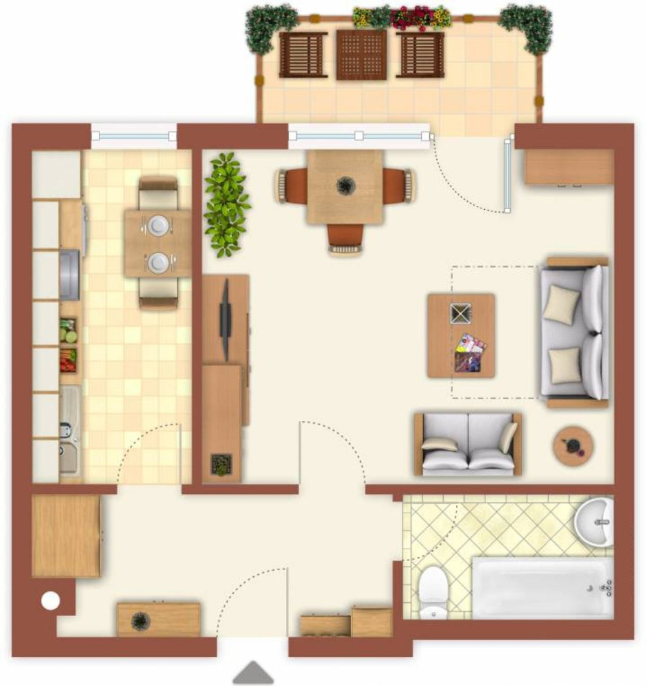 Die Wohnfläche beträgt ca. 34 m² und verteilt sich auf Wohn-/Schlafraum, Küche, innenliegendem Duschbad, Balkon mit sonniger Südausrichtung und Diele.