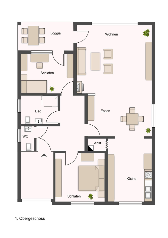Die Küche ist über eine halbe Wand mit Zugang vom Wohnzimmer aus, leicht abgetrennt. Hier haben Sie die unterschiedlichsten Gestaltungsmöglichkeiten. Zusätzlich bietet Ihnen der Küchenbereich einen kleinen Abstellraum.
