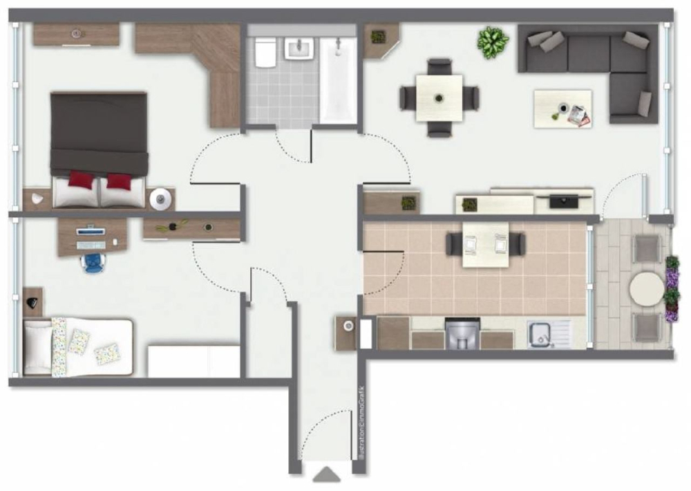 Die Wohnfläche von ca. 79 m² verteilen sich auf Wohnzimmer, Schlafzimmer, Kinderzimmer, Abstellraum, Loggia, Flur, Küche und Badezimmer.