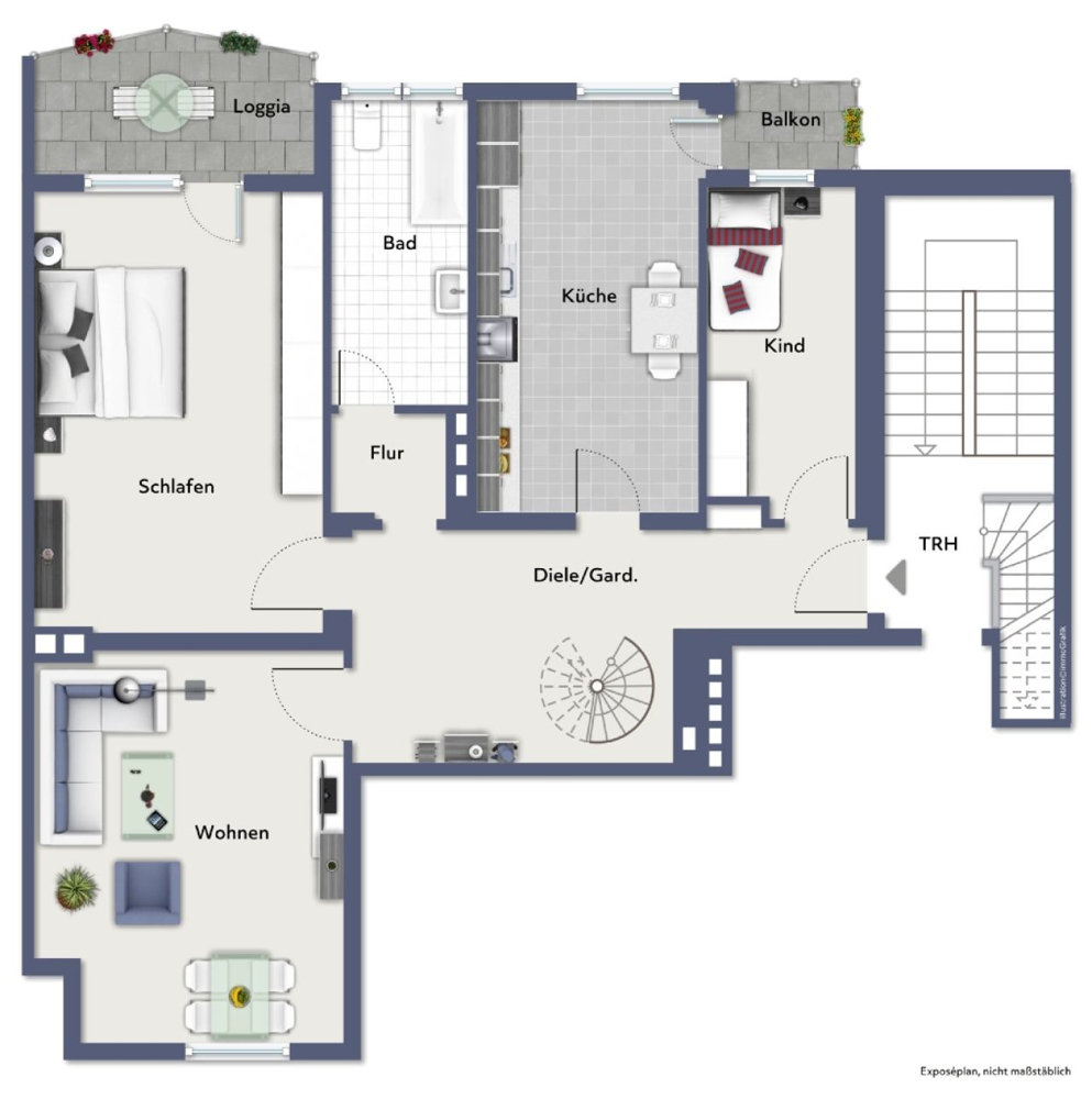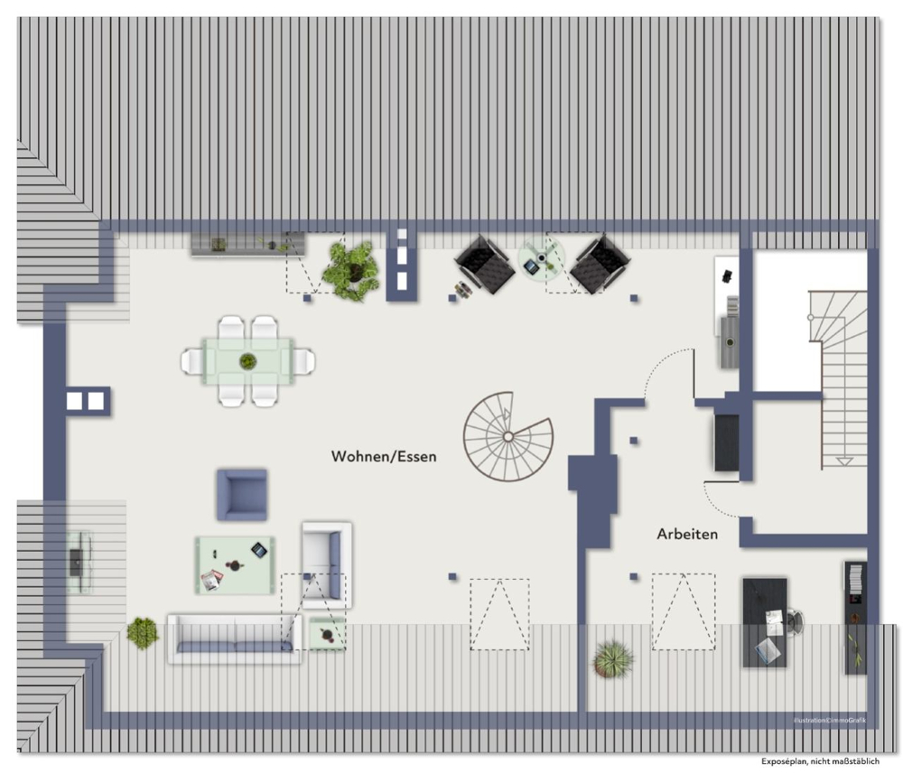 Beide Einheiten werden innerhalb der Wohnung mit einer Wendeltreppe verbunden. Zusätzlich ist die Fläche im Spitzboden auch über das Treppenhaus erreichbar. Die einzelnen Räumlichkeiten der Wohnung gliedern sich wie folgt: