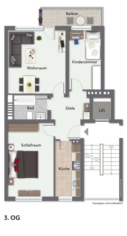 Der praktische Grundriss ermöglicht verschiedene Nutzungskonzepte. Der Aufzug bietet für Jung und Alt ein attraktives Zuhause.