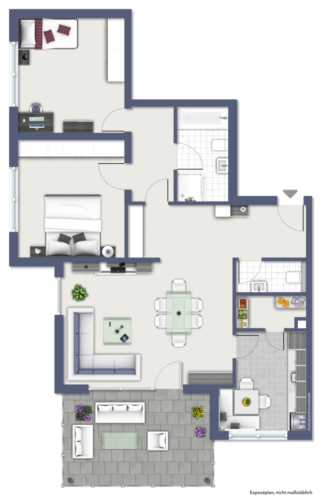 Die Wohnung verfügt über einen großzügigen Wohn-/Essbereich mit Zugang zum großen Balkon in Südwestausrichtung, ein Badezimmer mit Badewanne und Dusche, ein separates Gäste-WC sowie zwei weitere Wohn-/Schlafräume.