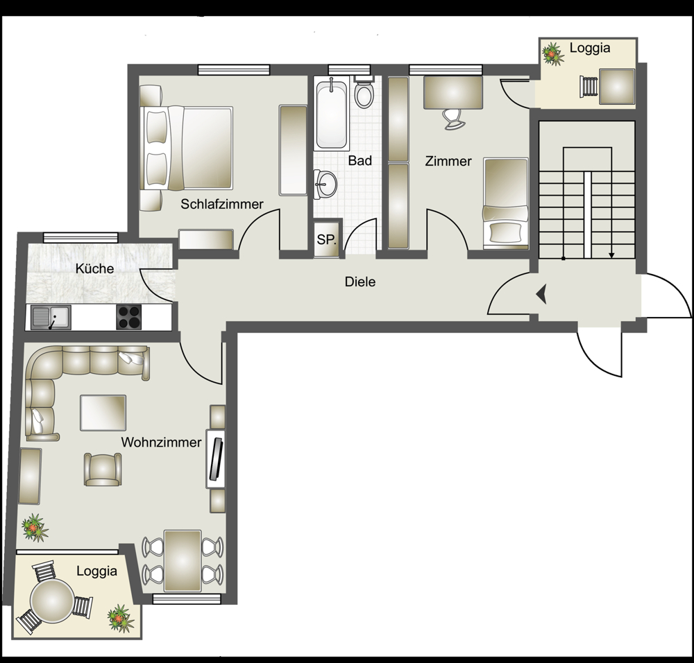 Die Wohnung verfügt über einen großzügigen Wohn-/Essbereich mit Zugang zum Balkon, eine kleine Küche, ein Tageslichtbadezimmer mit Badewanne, ein Schlafzimmer sowie ein kleines, drittes Zimmer, welches sich hervorragend als Büro / Home Office, Gästezimmer oder Ankleide- oder auch Kinderzimmer eignet. Das dritte Zimmer hat einen zweiten Balkon zur Hofseite gelegen. Die vorhandene Einbauküche kann gegen Abstand vom Vormieter übernommen werden.