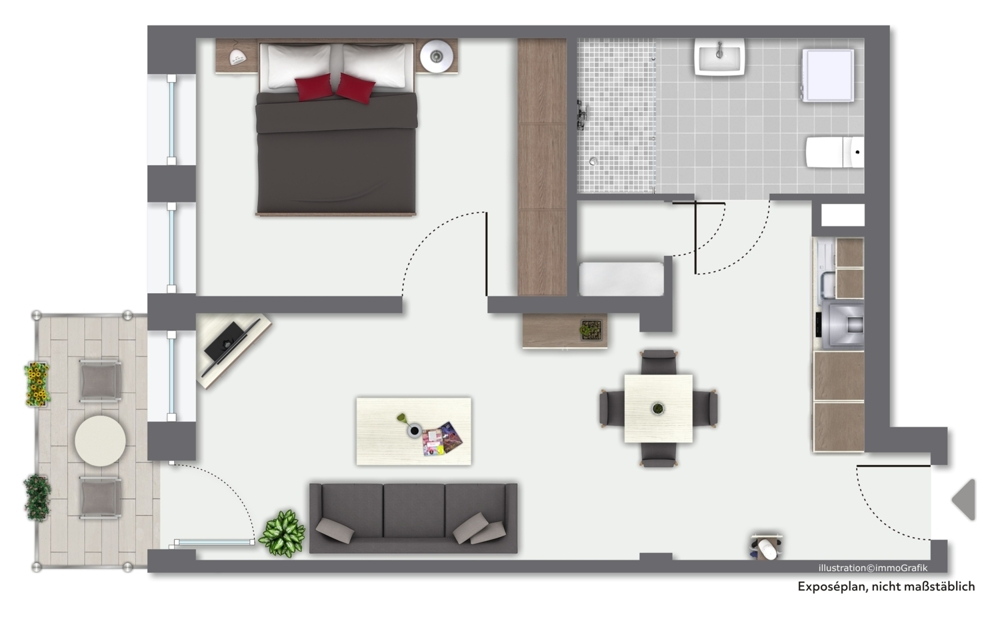 Die Wohnung verfügt über einen Wohn-/Essbereich mit offener Küche sowie Zugang zur Terrasse, ein Badezimmer, ein Schlafzimmer sowie einen kleinen Abstellraum.