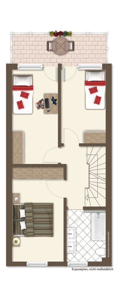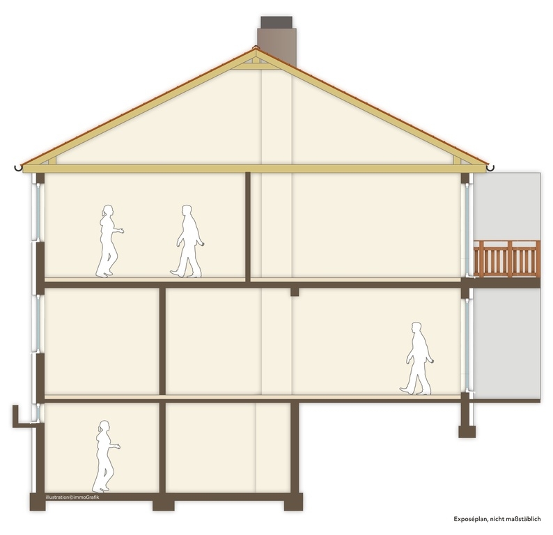 Über 130 m² Wohn-/Nutzfläche auf vier Wohnebenen (Erdgeschoss, Obergeschoss, Dachgeschoss, Kellergeschoss) stehen den Bewohnern zur Verfügung und bieten zahlreiche Nutzungsmöglichkeiten sowie genügend Platz zur persönlichen Entfaltung. Im Erdgeschoß befindet sich neben der Küche und dem Gäste-WC der großzügige Wohn-/Essbereich mit Kaminofen sowie Zugang zur Terrasse und dem eigenen Garten. Im Obergeschoss liegen neben dem Tageslichtbadezimmer drei weitere Wohn-/Schlafräume, zwei Zimmer haben Zugang zum Balkon auf der Gartenseite. Das Dachgeschoss kann zusätzlich wohnlich genutzt werden. Eine weitere Vergrößerung durch eine Gaube wäre umsetzbar. Der Keller bietet neben der Waschküche und dem Öltankraum einen weiteren Raum mit der Heizungsanlage und Staumöglichkeiten.