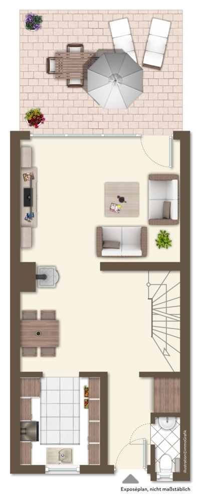 Die Terrasse und der Garten sind pflegeleicht angelegt. Der Garten hat ein Gartenhaus und einen weiteren Zugang zur Straße im hinteren Bereich.